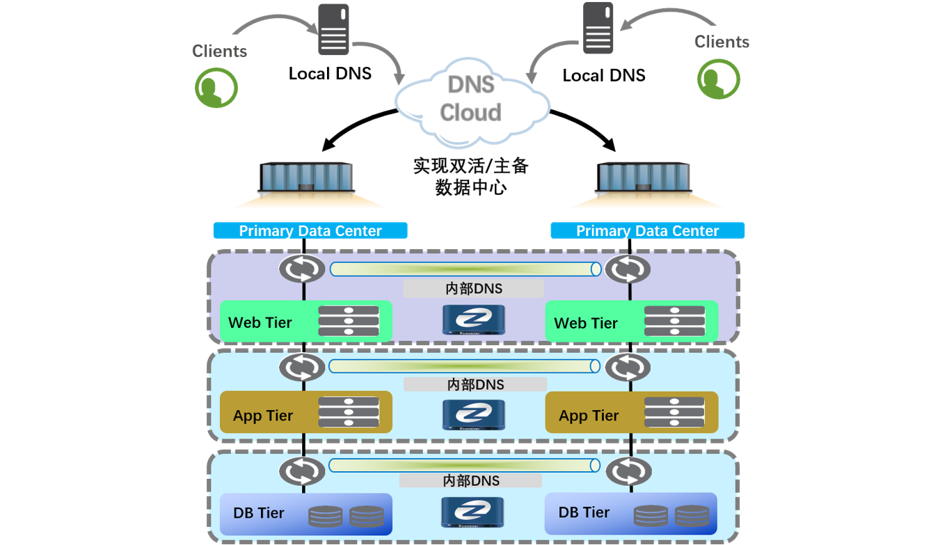 以“两地三中心”的云数据中心建设为基础,生产灾备一体化保障业务陆续在性为目标,着力于客户的需求,自顶而下进行云数据中心整体规划,其中的域名解析服务是整体规划中不可或缺的一部分,是用户应用最直接面对的门户基础服务,是解决应用容灾与IP地址解耦的不二选择。